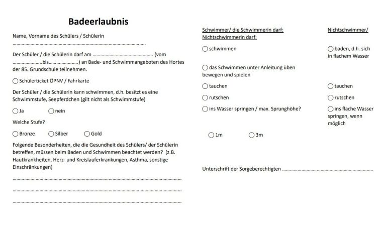 Sollte Ihr Kind zum Schwimmen in die Klotzscher Schwimmhalle mitgehen wollen benötigt es eine Badeerlaubnis. Hier können Sie diese downloaden und ausgedruckt mitbringen.