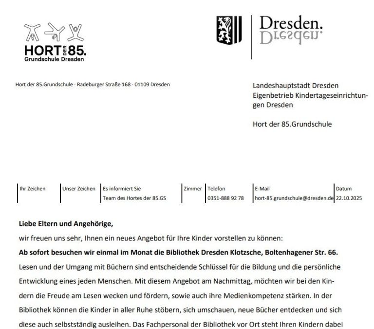 Einmal monatlich können wir die Bibo Klotzsche besuchen und benötigen dafür von Ihnen und Ihren Kindern die Bestätigung, dass Sie sich gemeinsam mit den Regeln vertraut gemacht haben. Hier können Sie das Dokument downloaden.